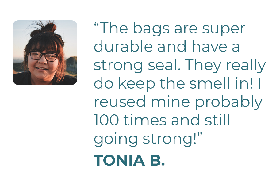 "The bags are super durable and have a strong seal. They really do keep the smell in! I've reused mine probably 100 times and still going strong!"